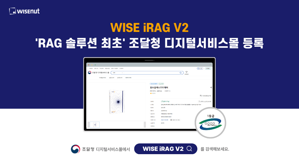 - GS인증 1등급 및 조달청 디지털서비스몰 최초 등록으로 신뢰도 및 활용도 UP - AI 에이전트 도입 필수 솔루션으로, 공공 행정 전반의 AI 전환(AX) 가속화 견인 기대 인공지능(AI) 에이전트 전문기업 와이즈넛(096250, 대표이사 강용성)은 국내 최초 RAG 솔루션 ‘WISE iRAG V2(와이즈 아이랙)’가 조달청 디지털서비스몰에 ‘RAG 솔루션 최초’ 등록되었다고 21일 밝혔다.