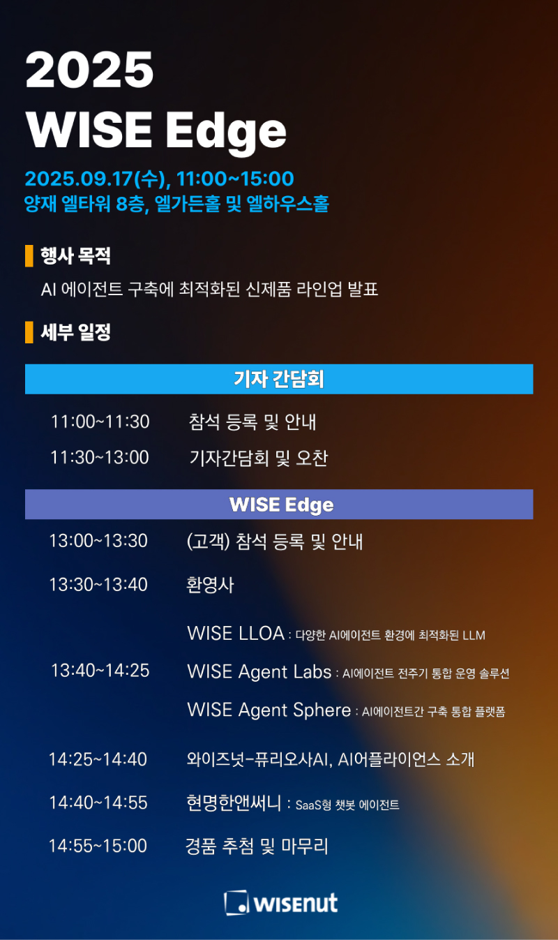 - LLM부터 SaaS형 챗봇 에이전트까지, 실전형 에이전트 제품 발표 AI 에이전트 전문기업 와이즈넛(대표 강용성, 096250)은 오는 9월 17일(수) 양재 엘타워에서 2025 하반기 ‘WISE Edge’를 개최하고, AI 에이전트 구축에 최적화된 다양한 신제품을 전격 공개한다고 밝혔다.